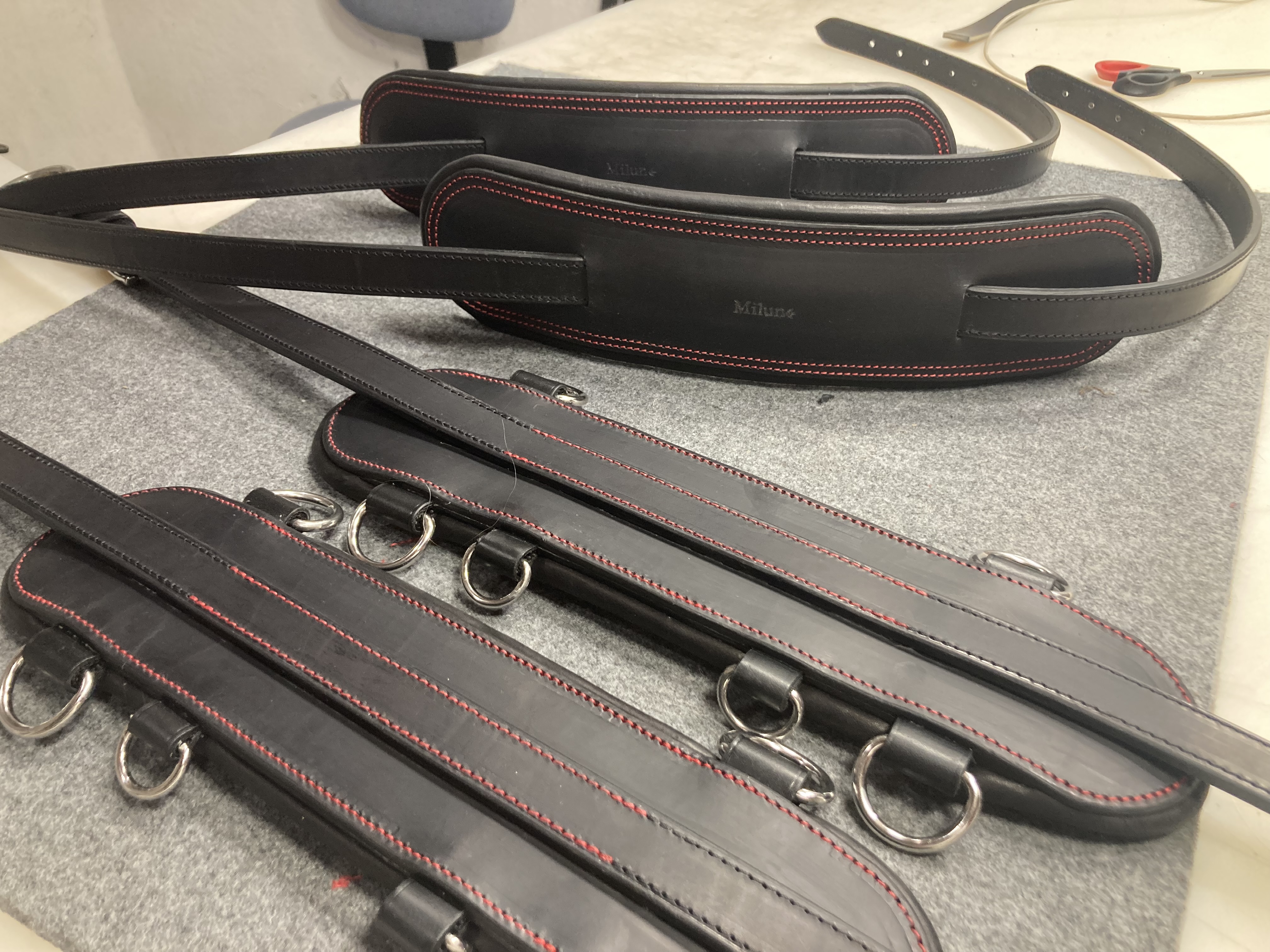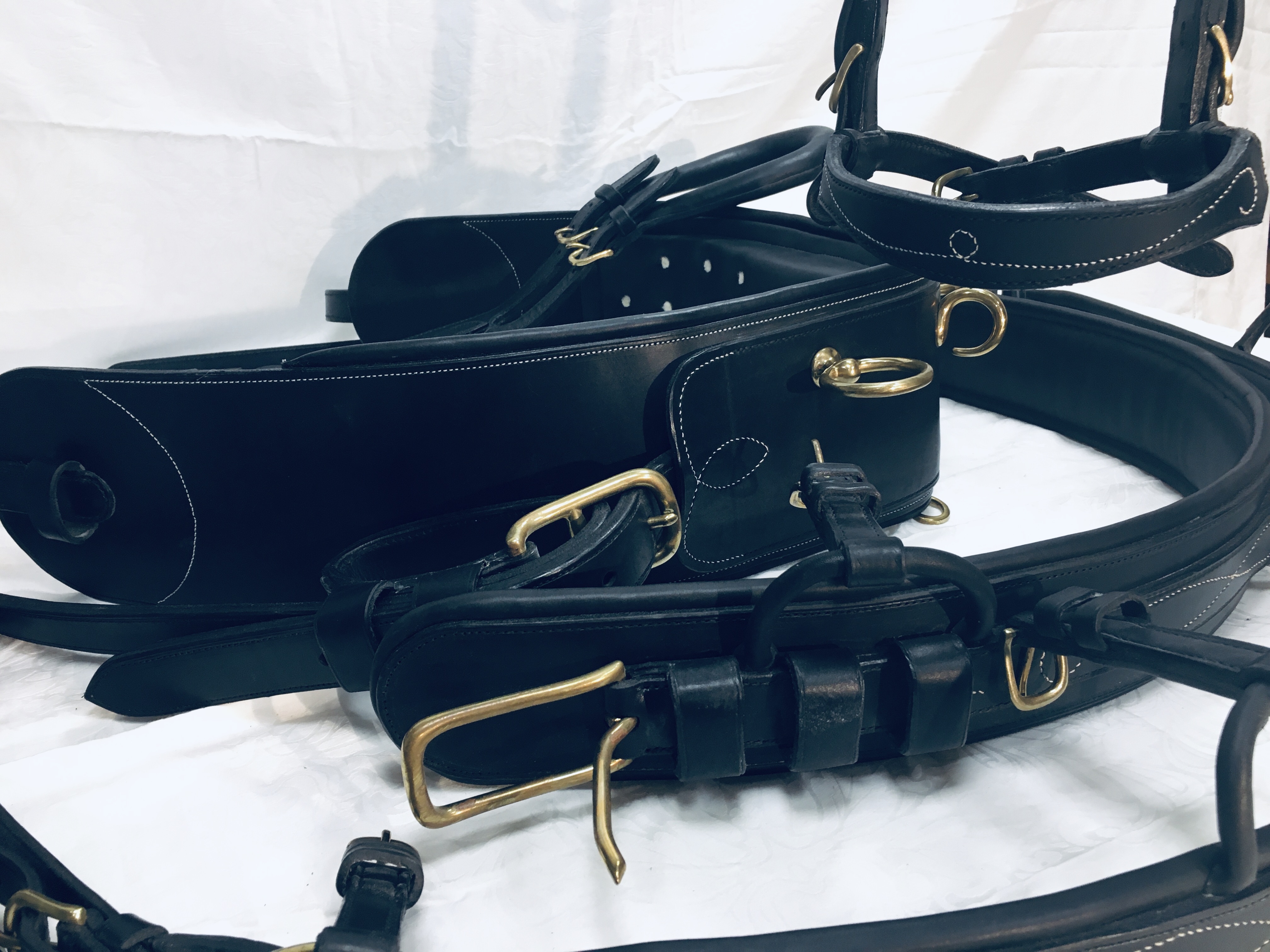 - Harnais en cuir noir, bouclerie laiton et cupro-aluminium avec coutures décoratives