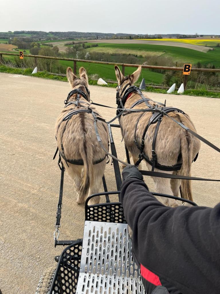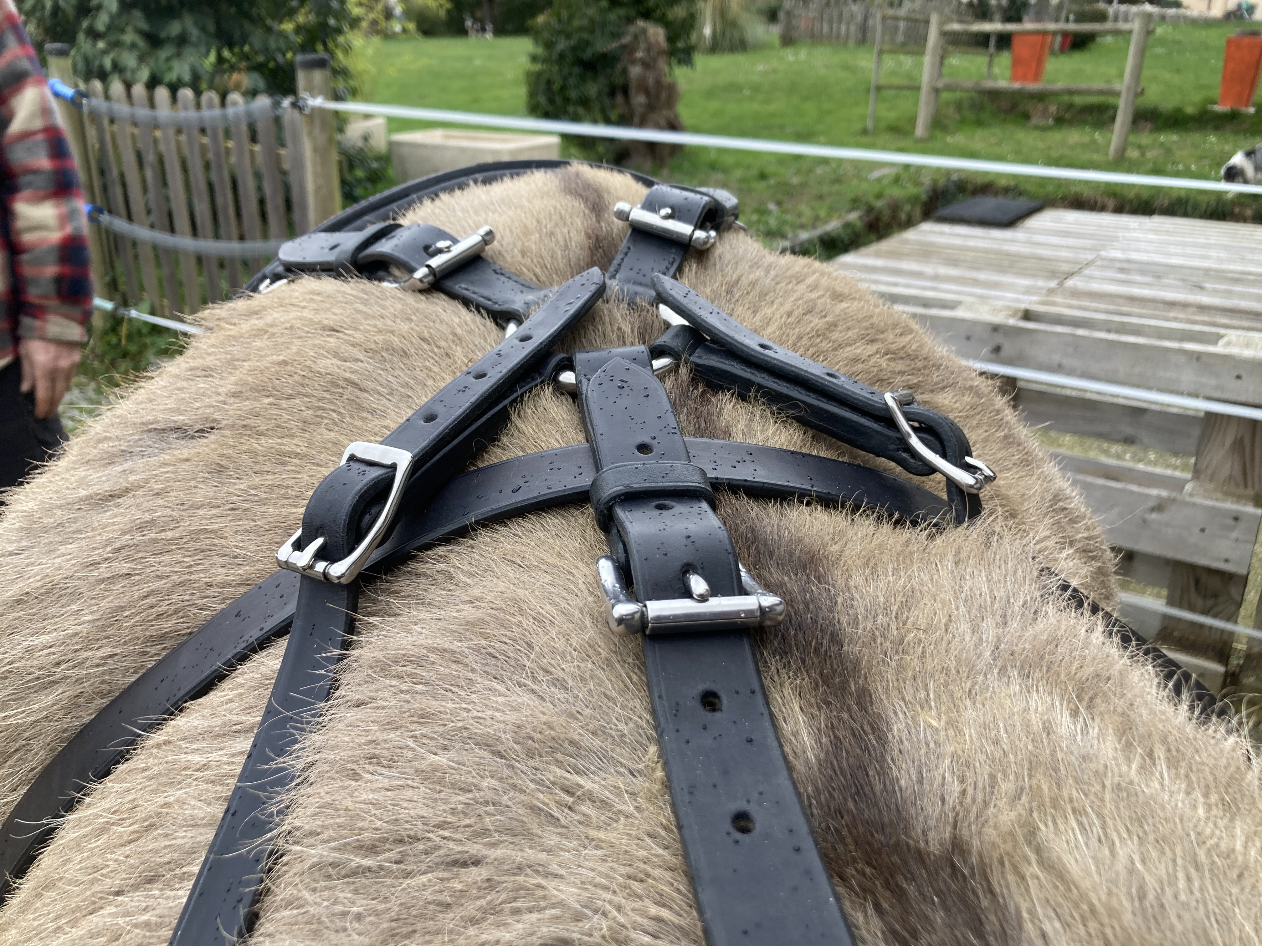 - Exemple d’adaptation d’un harnais en paire classique en harnais Grand Vallier pour 2 ânes (cuir noir, bouclerie inox):
