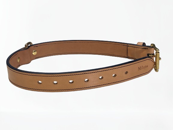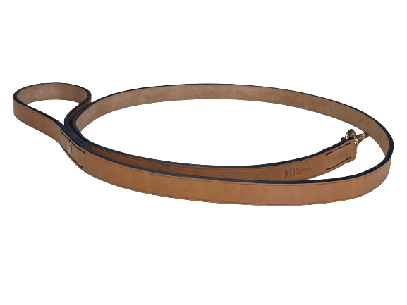 - Laisse classique longueur 1 m ou 1,50 mètre, largeur 18 mm en cuir végétal couleur naturelle, bouclerie laiton cousue main :