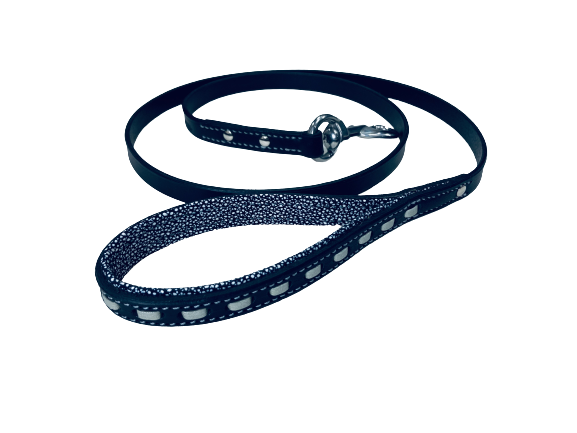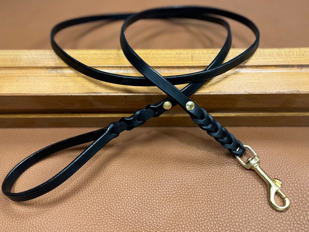 - Laisse de présentation en cuir noir largeur 10mm, longueur 1,50m, mousqueton inox ou laiton.