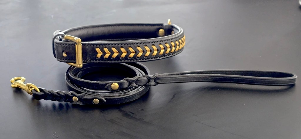 Ensemble laisse de présentation et collier à chevrons, bouclerie laiton : 139€