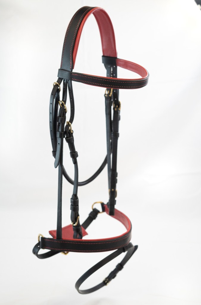 - Bridon « Adagio » en cuir noir doublé veau rouge, bouclerie laiton, sous-gorge cousue rond