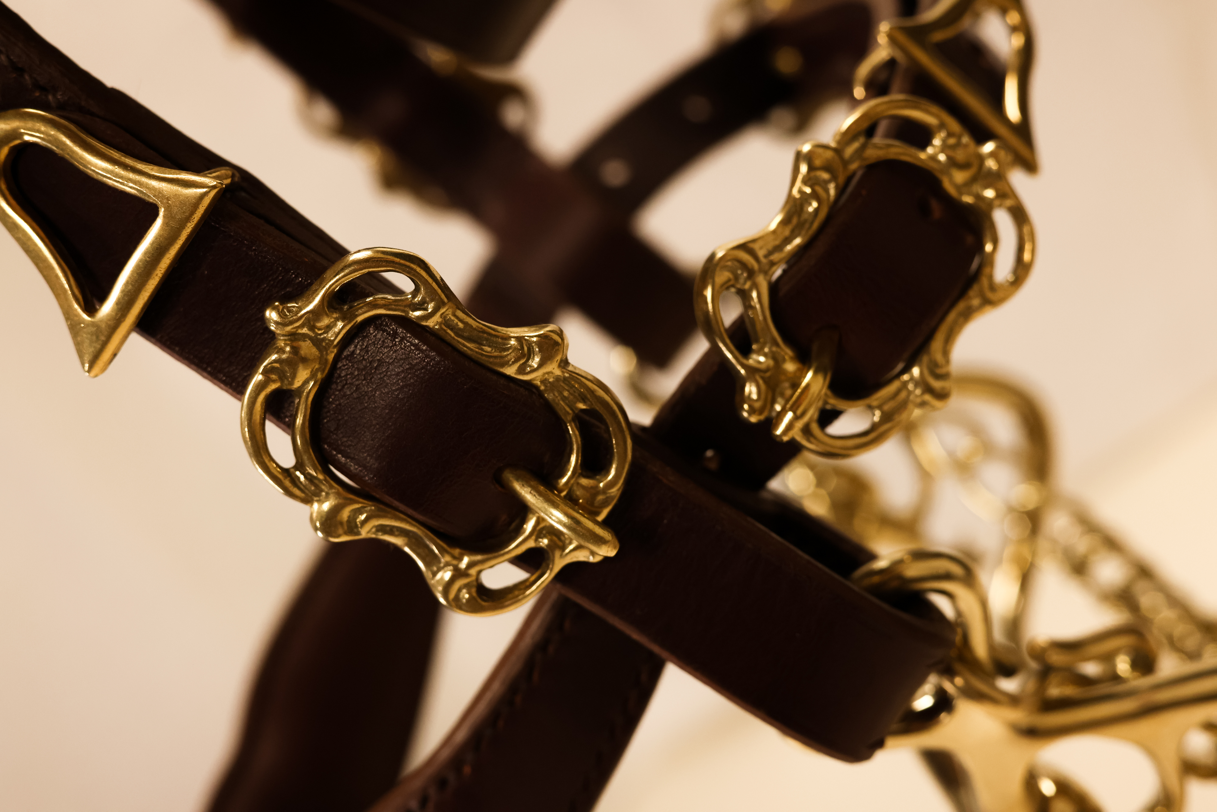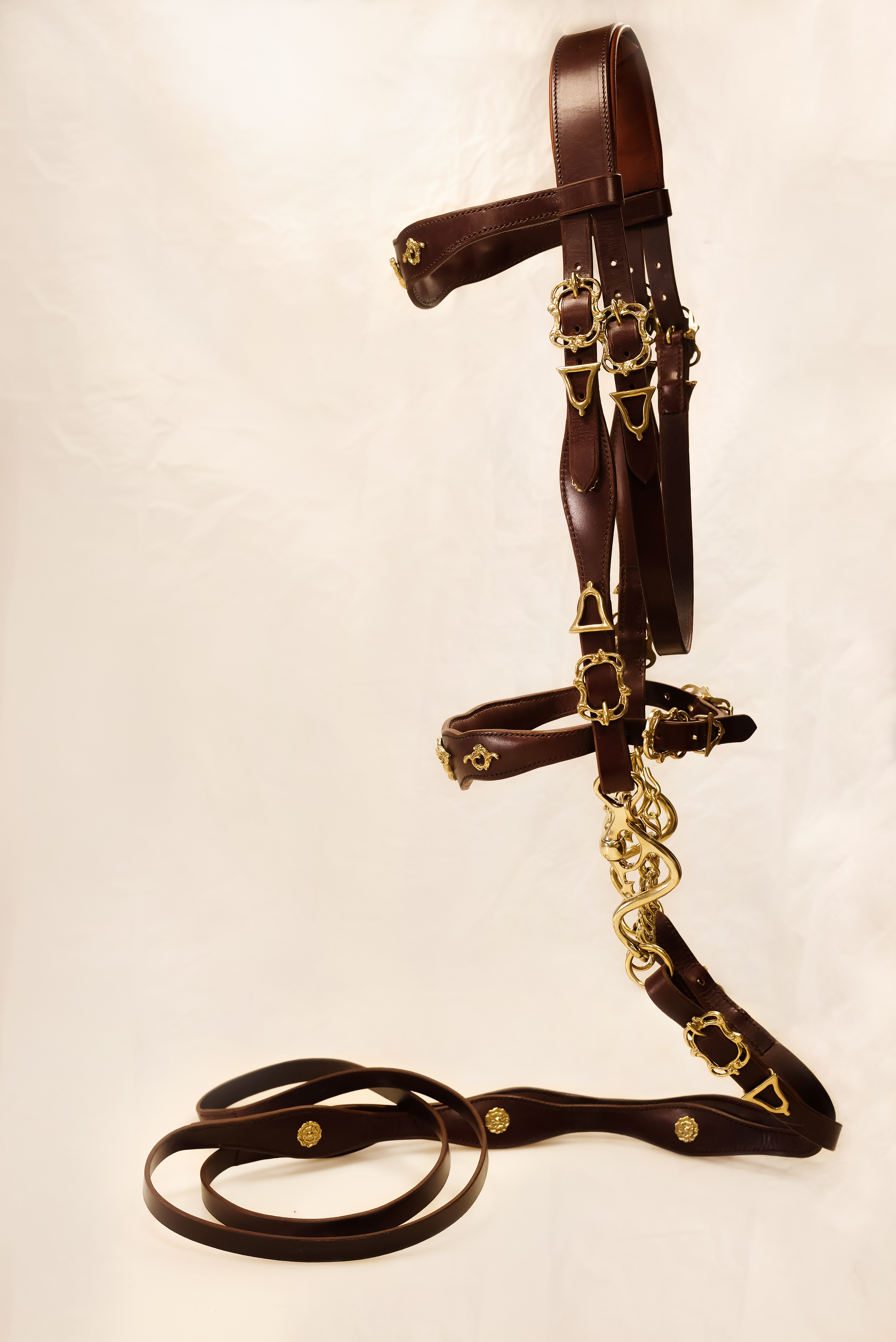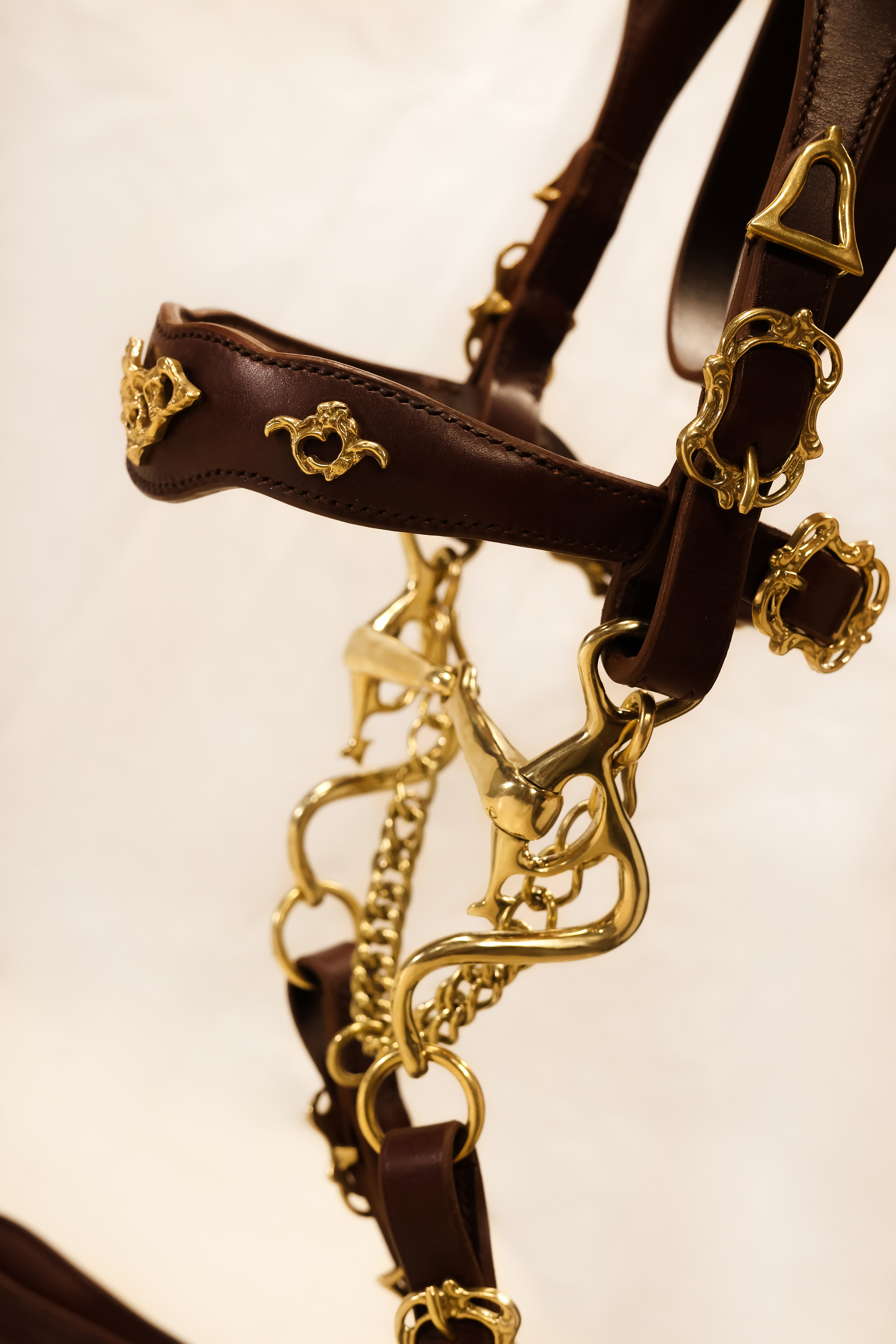 - Bridon portugais cuir havane, têtière doublée veau, boucles ornementées en laiton, cousu main. Une adaptation en bride ou pour le spectacle sont possibles.