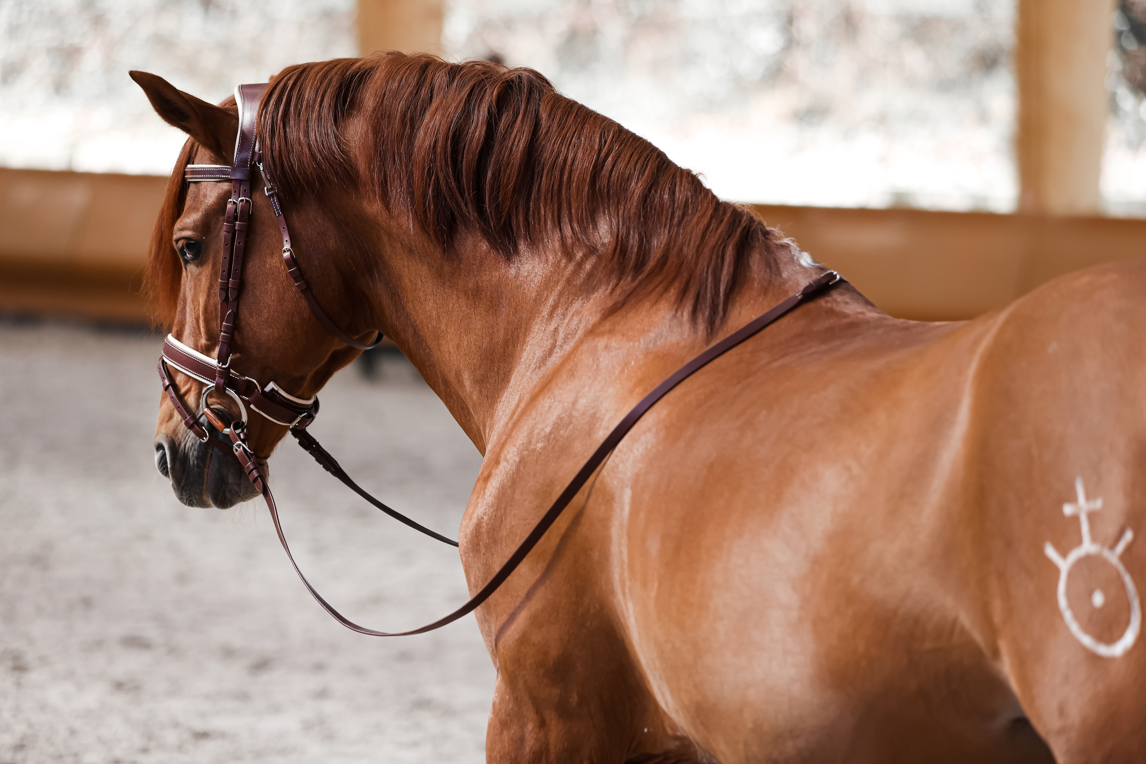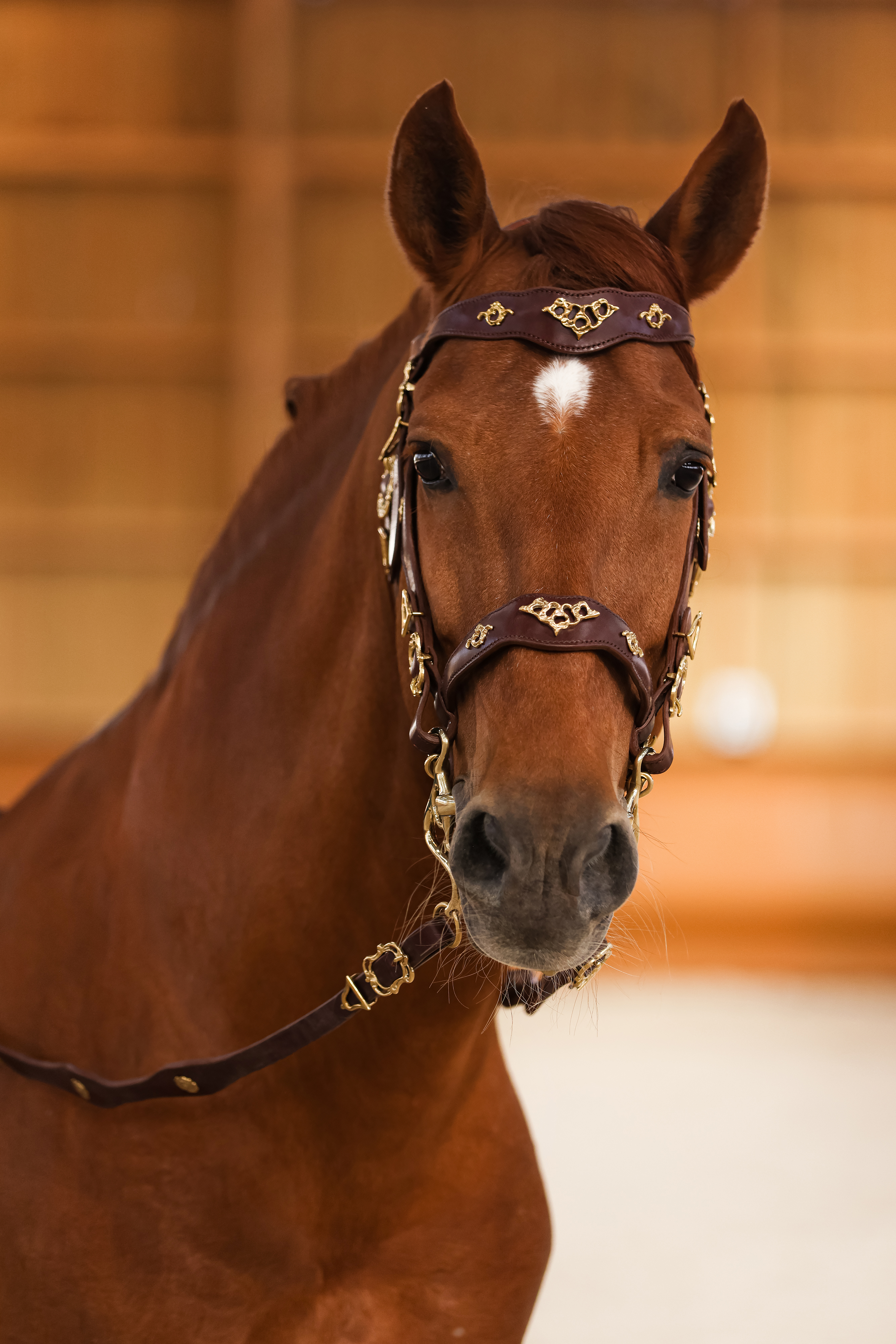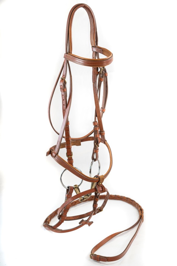 - Bridon portugais cuir havane, têtière doublée veau, boucles ornementées en laiton, cousu main. Une adaptation en bride ou pour le spectacle sont possibles.