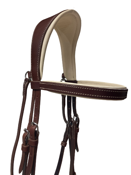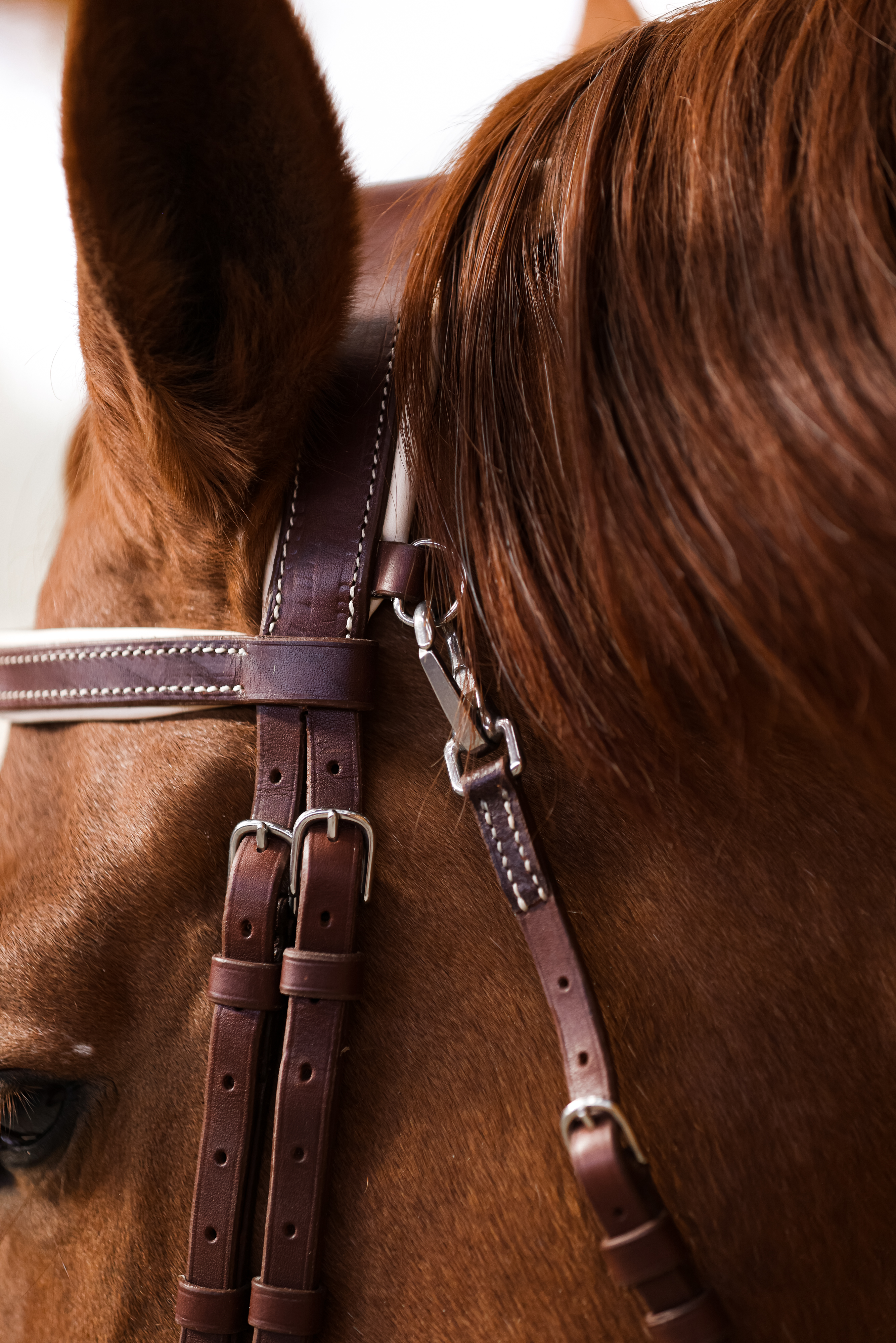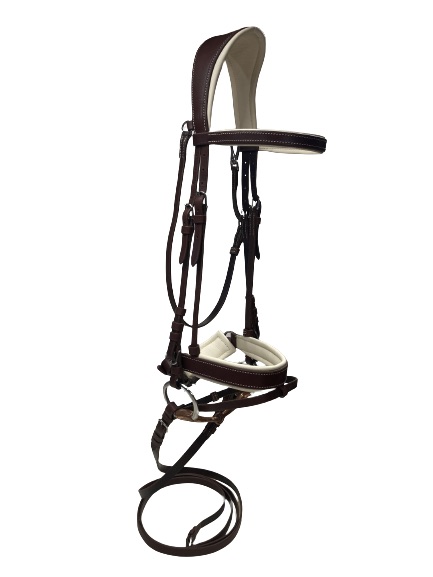 - Bridon havane avec têtière anatomique doublé de veau crème, bouclerie inox. sous-gorge indépendante avec mousqueton et réglable.