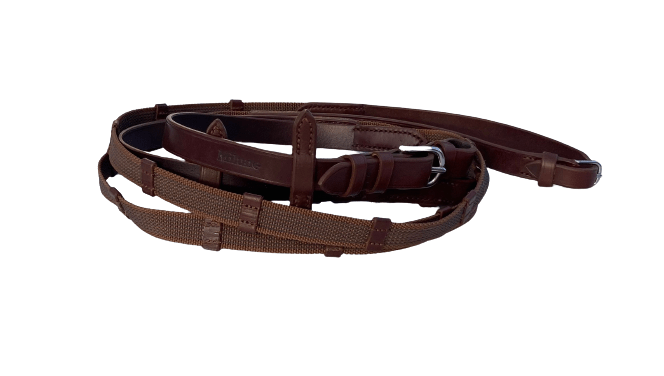 - Rênes mixtes cuir et sangle tissée caoutchouc avec petits arrêtoirs antidérapants et deux olives. Choix de couleurs et de dimensions.