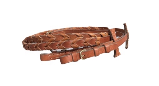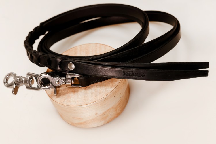 - Rênes de randonnée en cuir : avec deux mousquetons mexicains, assemblées par tressage et laissant un flot d’une vingtaine de centimetres remplaçant une cravache. Longueur, largeur et couleur sur mesure.