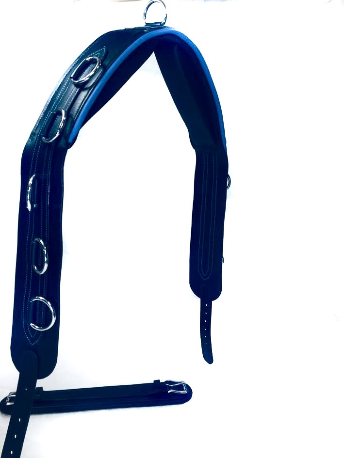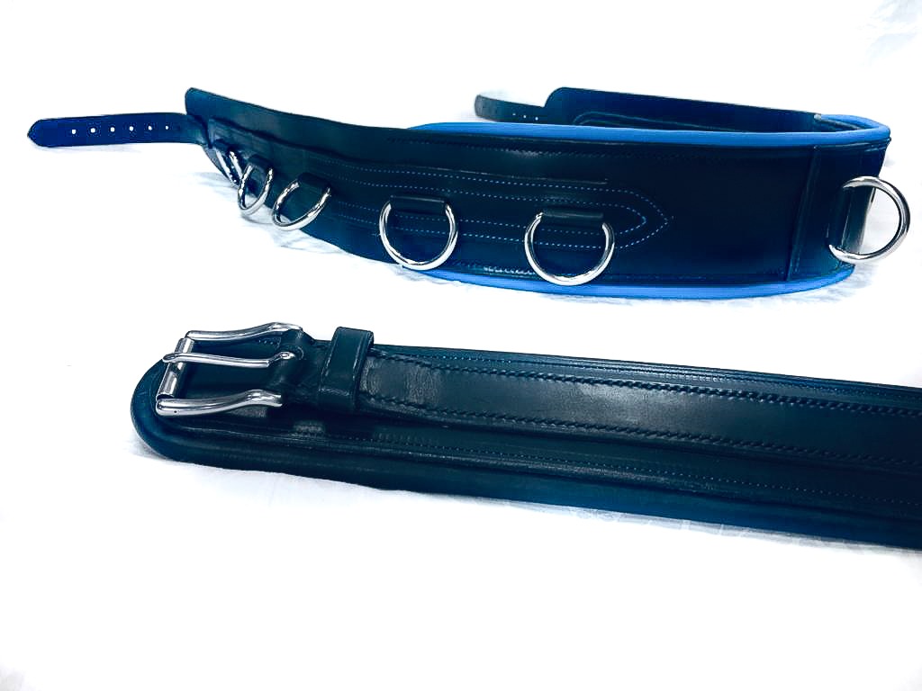 - Surfaix 11 anneaux inox en cuir noir, panneaux en veau noir et jonc bleu cousu main et piqué au fil bleu.